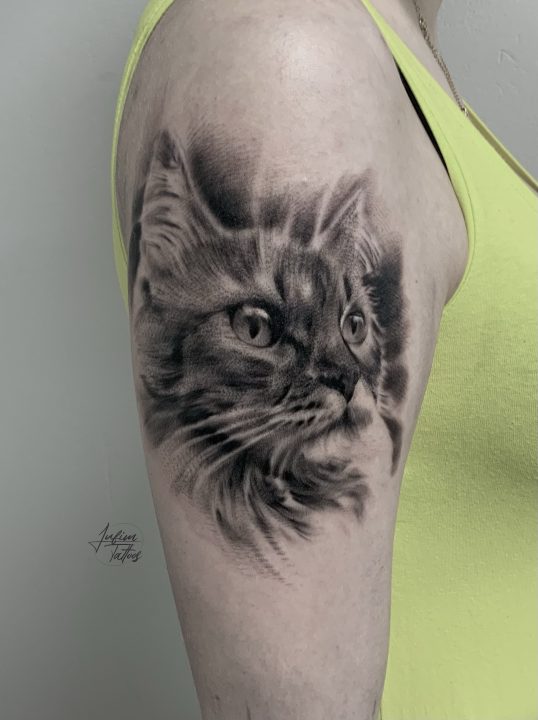 Łukasz wykonuje zarówno mikrorealistyczne tatuaże, jak i rozbudowane projekty zajmujące całą powierzchnię pleców czy rękawa. Z łatwością oddaje strukturę skóry, futra, metalu czy tkaniny, dzięki czemu jego tatuaże wyglądają jak żywe.